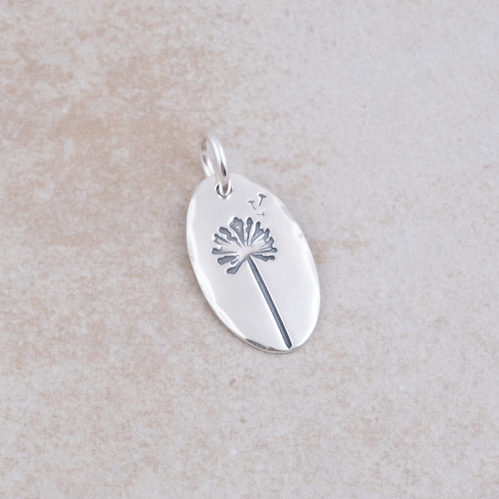 This sterling pendant features a stamped dandelion, created as a reminder of Matthew 11:28. "Come to me, all you who are weary and burdened, and I ...