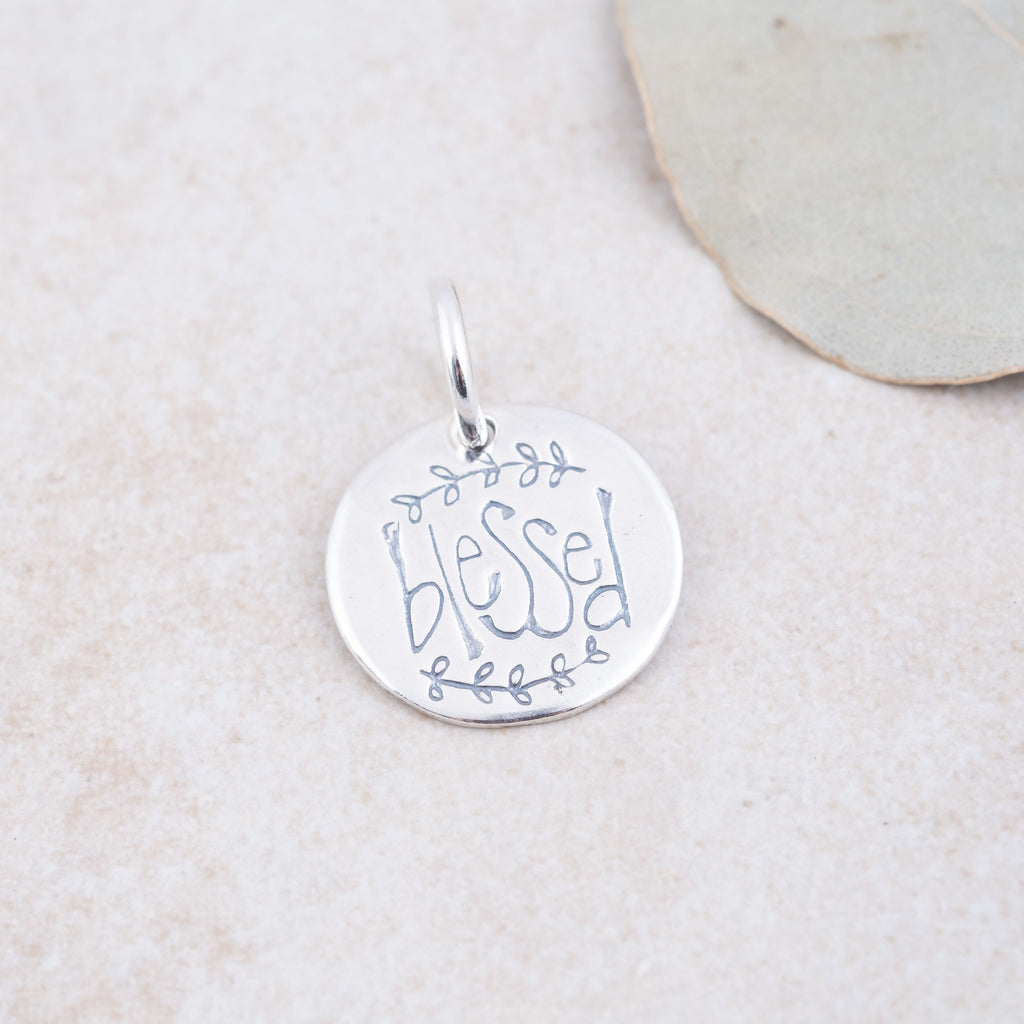 Classic round pendant with whimsical laurel wreath and etched writing. Our earthly blessings are temporary, but our faith in Christ is eternal, bec...