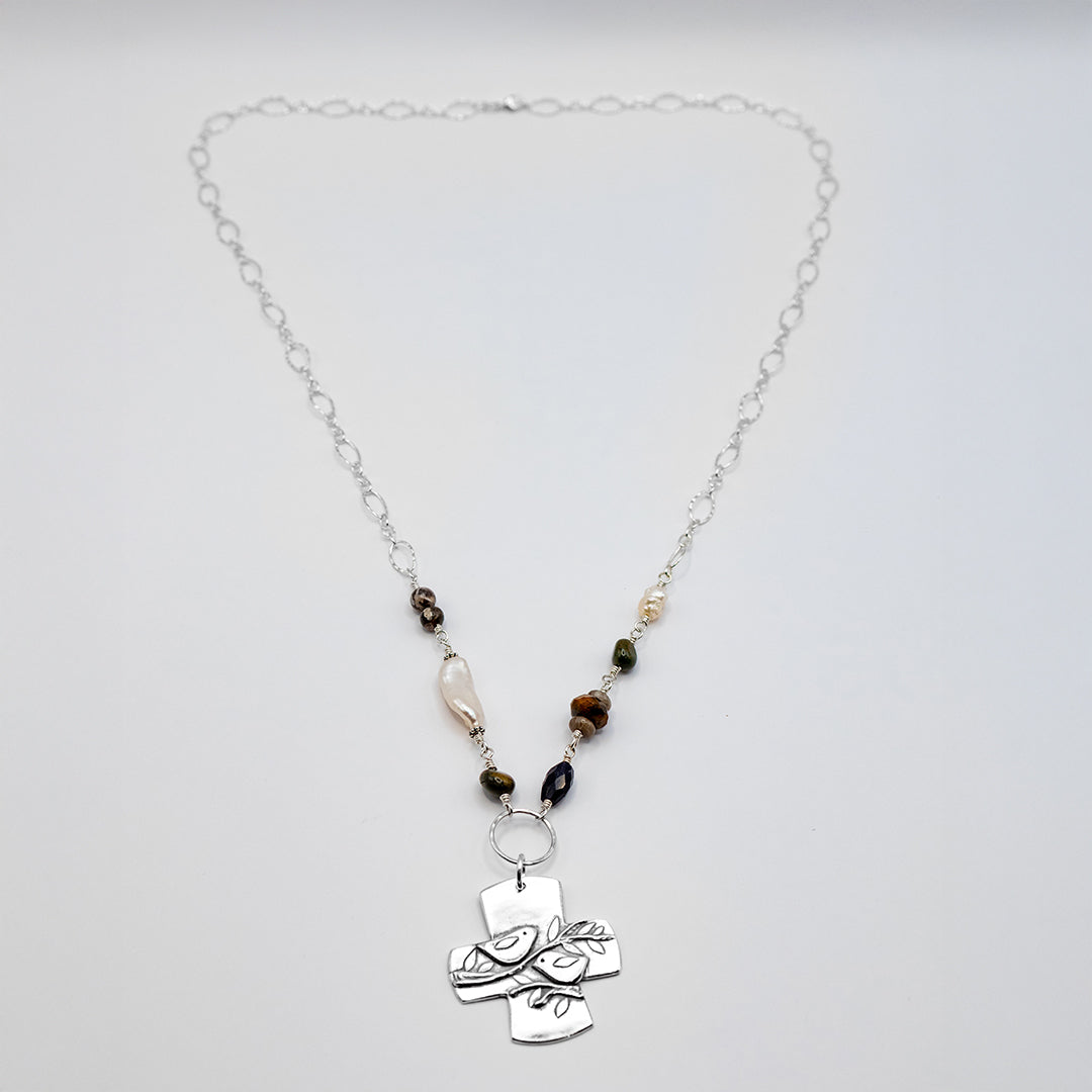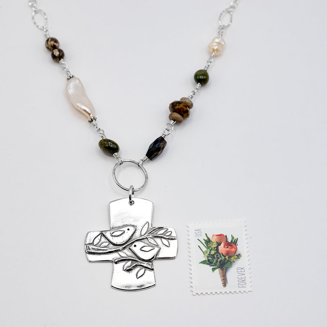 An earthy mix of genuine jaspers and freshwater pearls brings richness and texture to this long, adjustable necklace—a meaningful statement piece and a lovely way to share your faith.