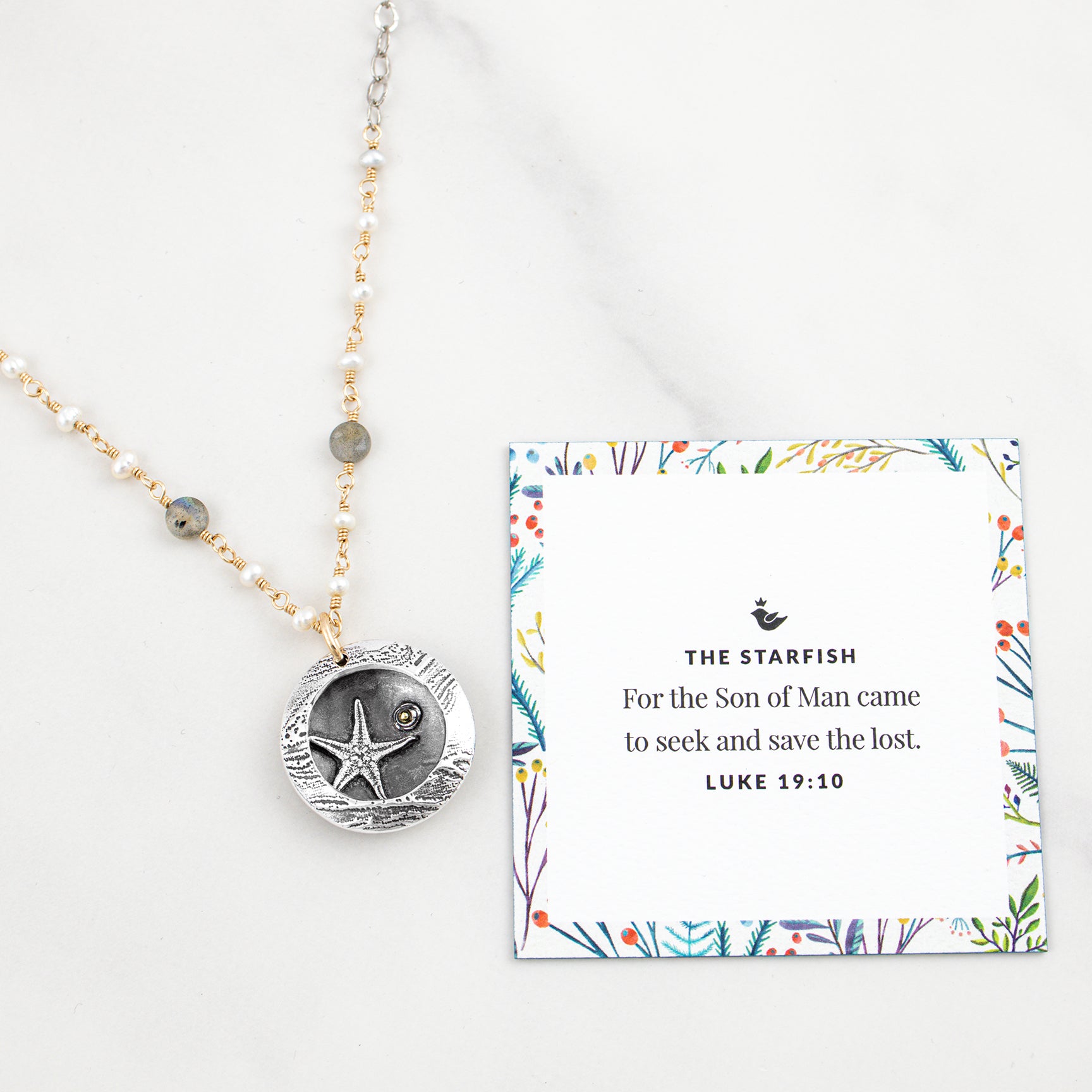 Wear this beautiful fine silver starfish as a reminder that Jesus is your Rescuer and Redeemer. The man on the beach was not discouraged by the vast number of starfish washed ashore. He continued to toss them back to sea. Like the man from the story, Jesus tenderly and lovingly rescued each of us.