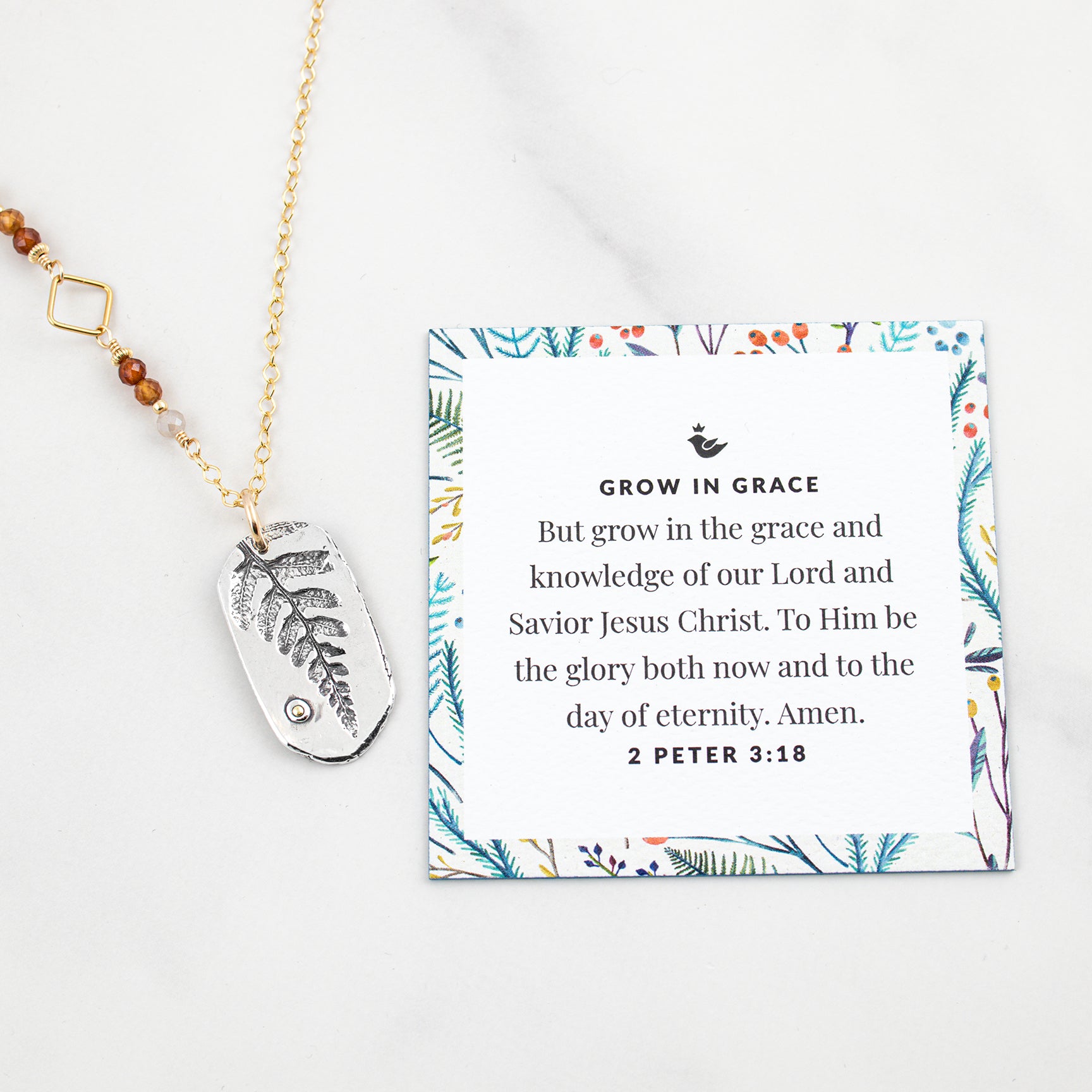 This gold-filled necklace features a fine silver leaf as a reminder to plant yourself in the Word and nurture your relationship with Christ! As you grow deeper in Him, you can't help but grow in grace.