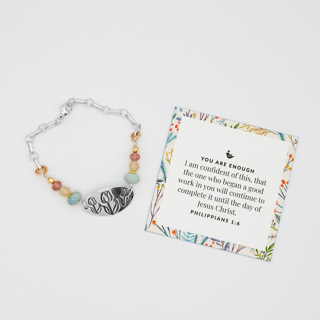 This hand crafted bracelet features a grouping of elegant tulips at its center to symbolize worthiness. May it remind you that you will always be enough in Christ Jesus!
