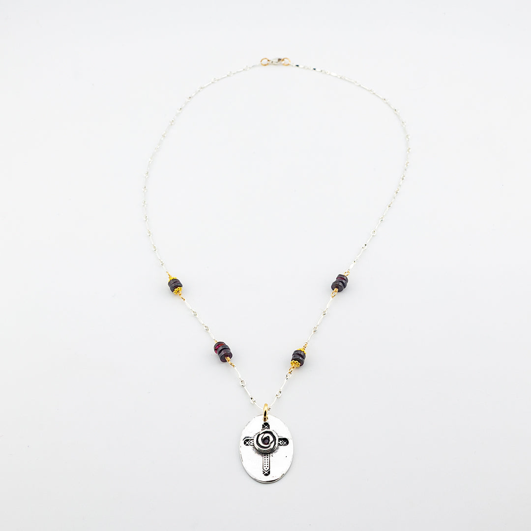 This beautiful cross pendant features a garnet at the center. Gold filled accents highlight garnet beads along the 20" chain.