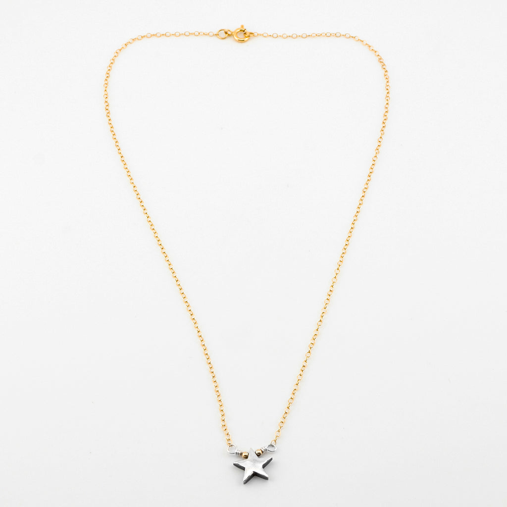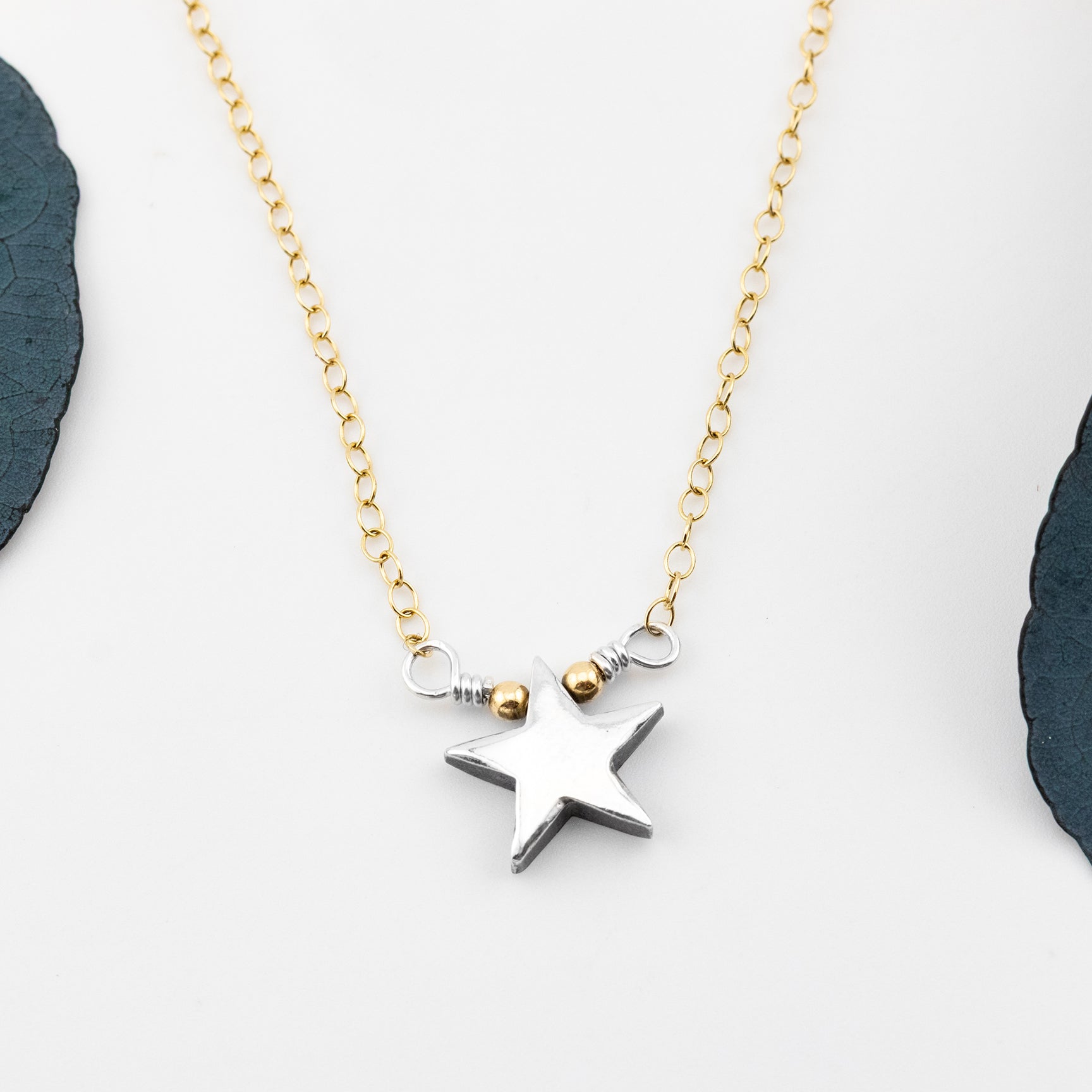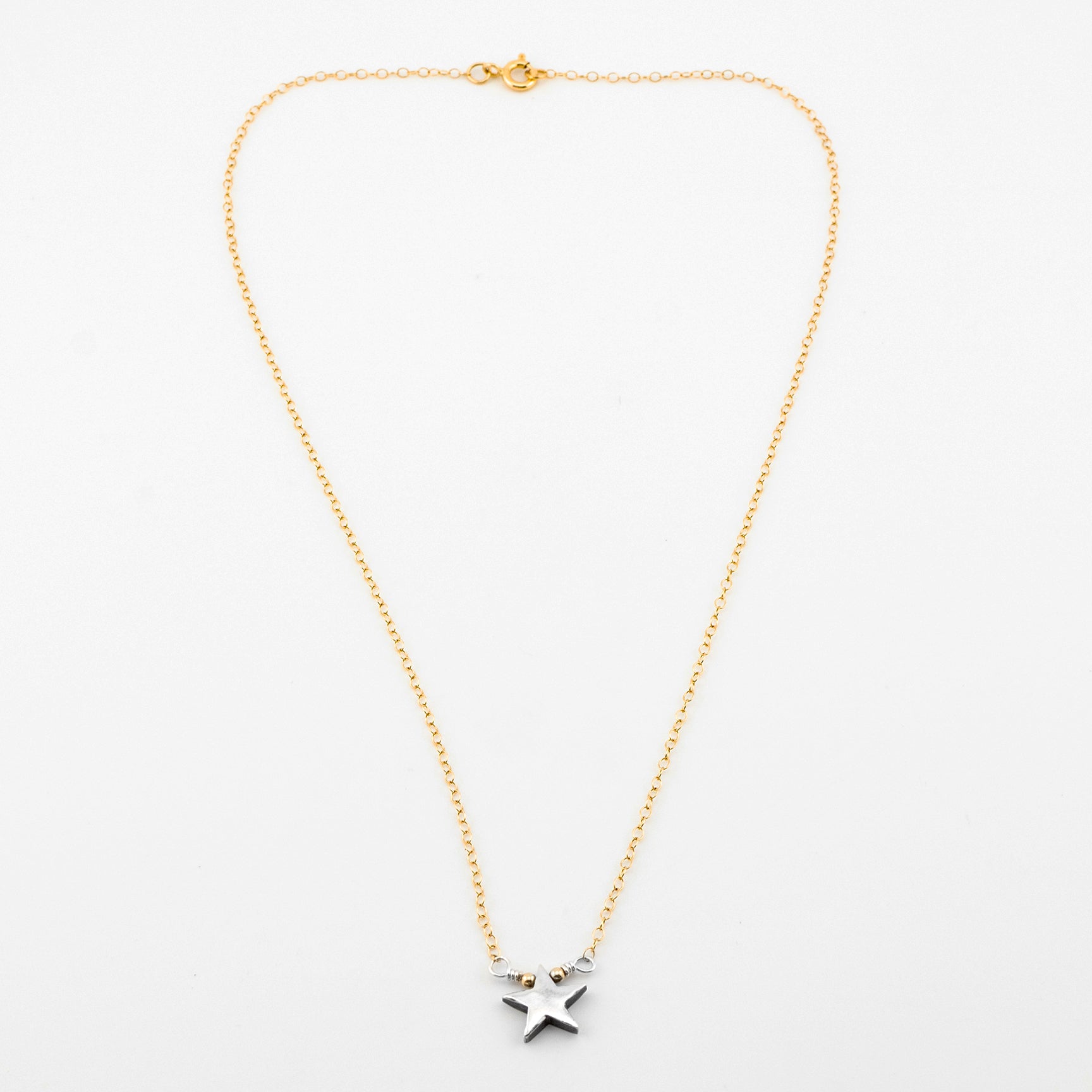 The stars in the sky shine and sparkle brightly so you can see them even in the dark of night. This petite silver star charm hanging from a sparkling gold filled chain. Created to remind you to shine so that others may see Christ in you!