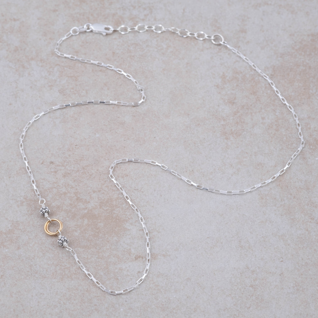 Striking sterling silver box chain featuring 14 karat gold-filled rings to represent your wedding bands.