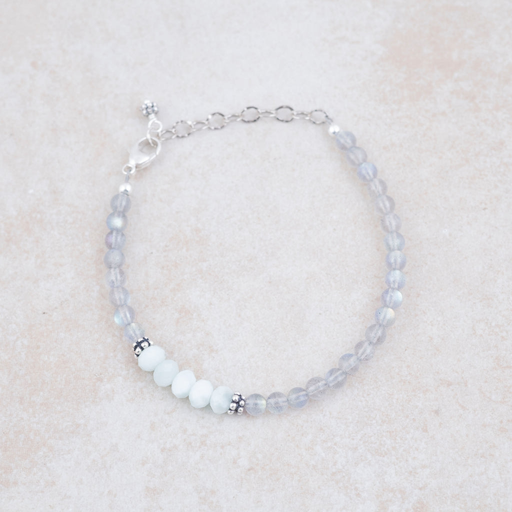 Beautiful beaded bracelet created using genuine labradorite that catches the light and frames soft green aquamarine. Pair with any Holly Lane Slide...