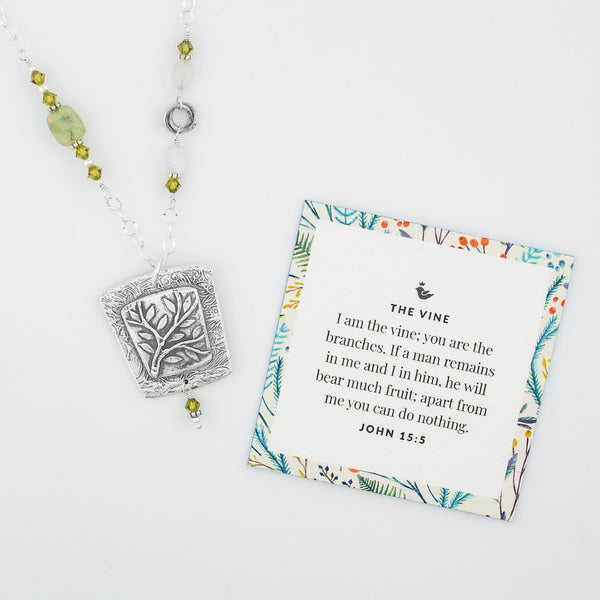 Inspired by John 15:5, this beautifully detailed vine pendant serves as a reminder that when we remain in Christ, He sustains, strengthens, and gr...