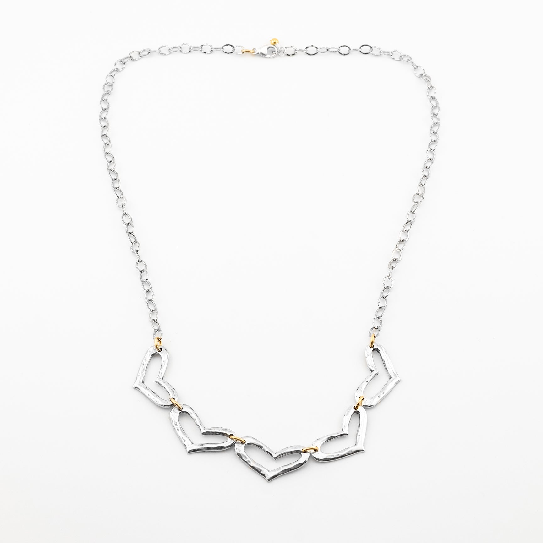 Five open sterling silver hearts dangle between delicate strands of oxidized sterling silver with gold-filled jump rings. Wear this necklace as a reminder that you are so loved—not only by the people in your life but also by your Savior. May this piece remind you that you are completely known, fully accepted, and deeply loved by Jesus. Find rest in His love and know that nothing will ever change it.