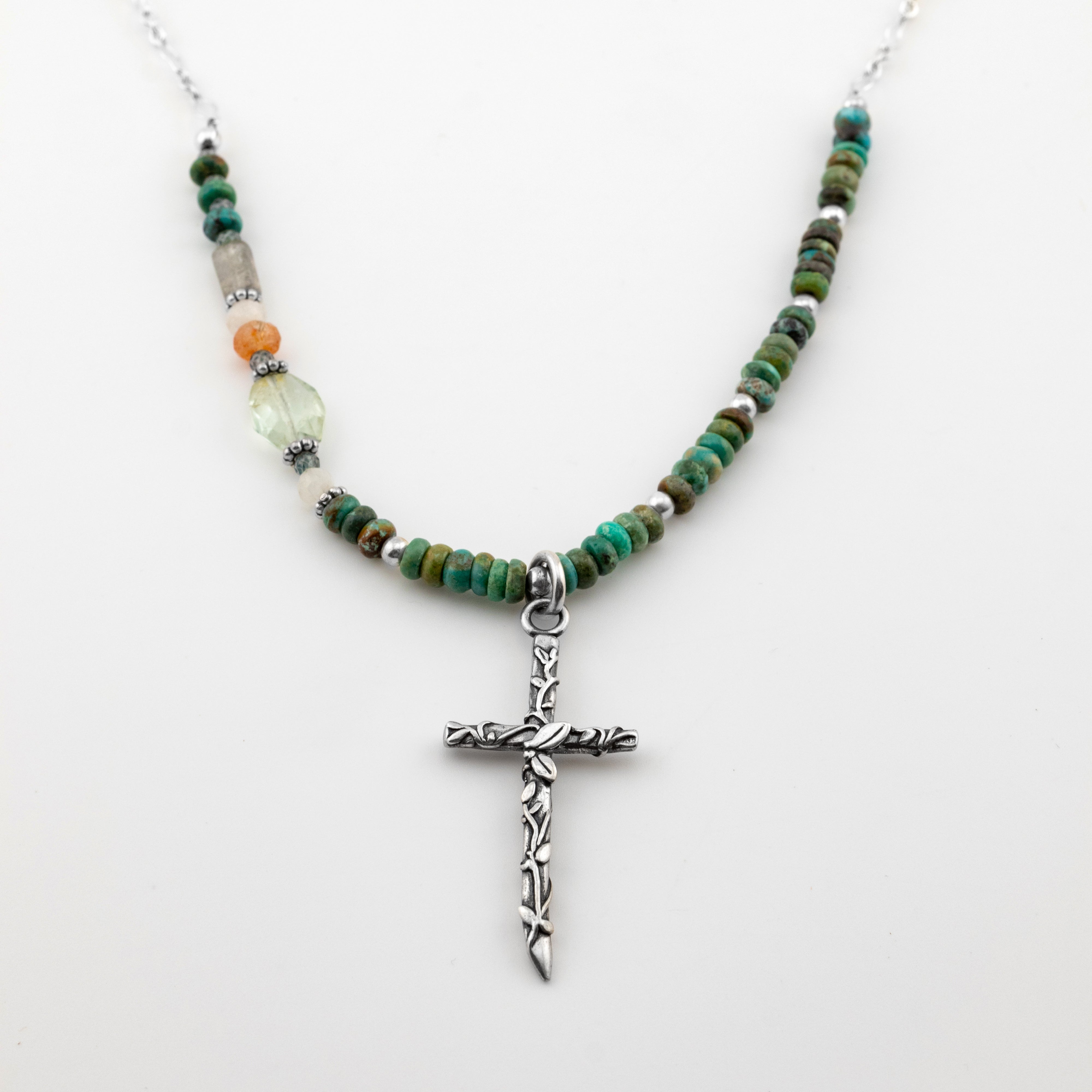 Oxidized sterling silver cross with carved vines, a wearable reminder of John 15:5, “I am the vine; you are the branches. If a man remains in me and I in him, he will bear much fruit; apart from me you can do nothing.”