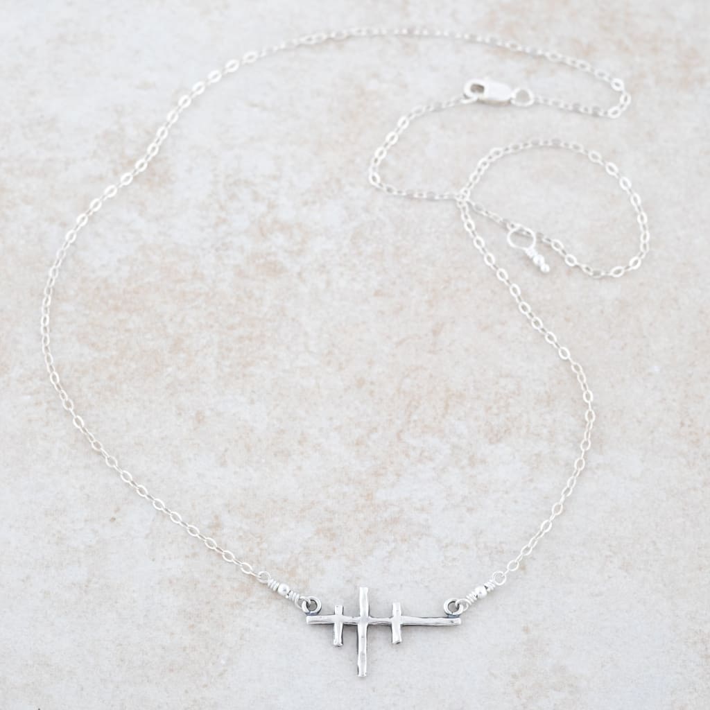 Light and petite, this elegant and adjustable bar necklace features a center beam connecting the three crosses of Calvary. A unique and meaningfu...