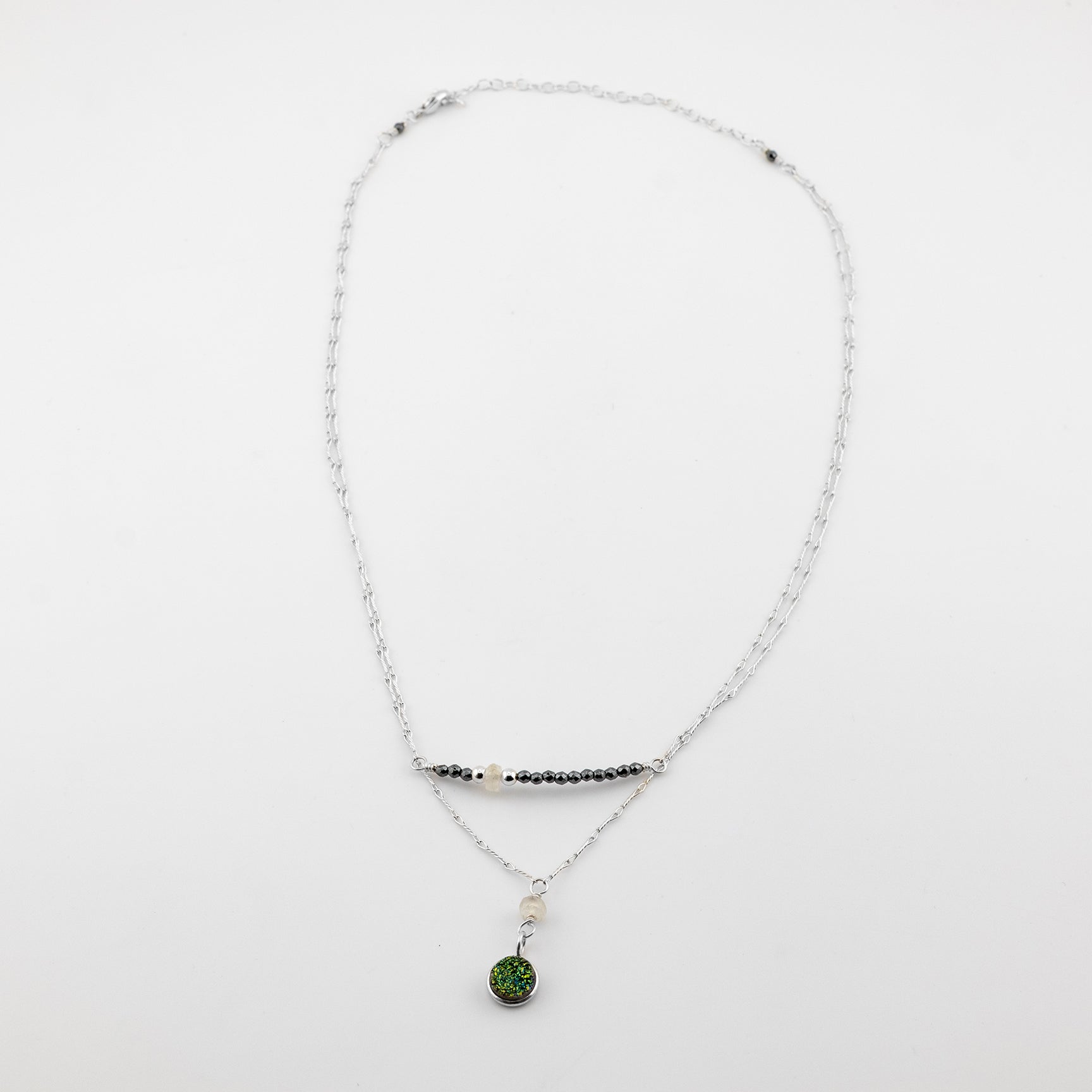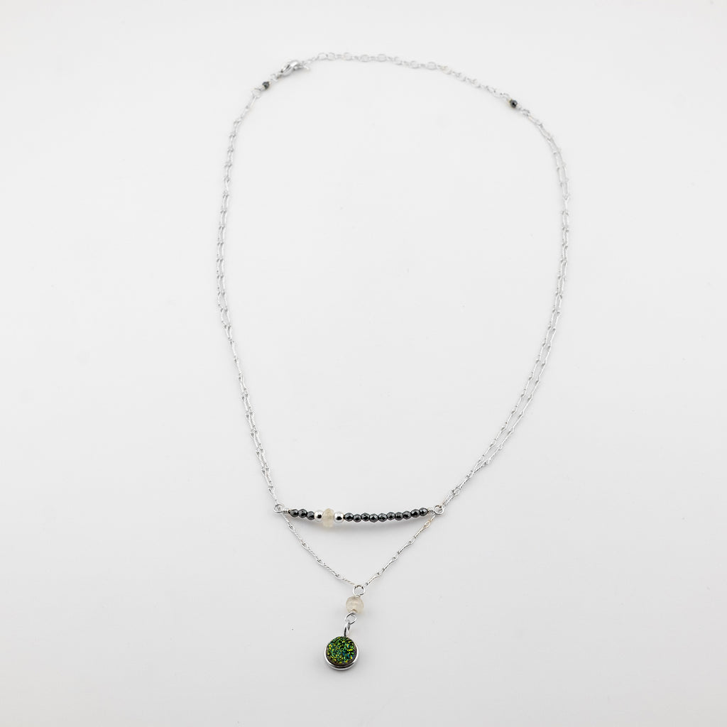- Features genuine moonstone, pyrite, and multicolored druzy
