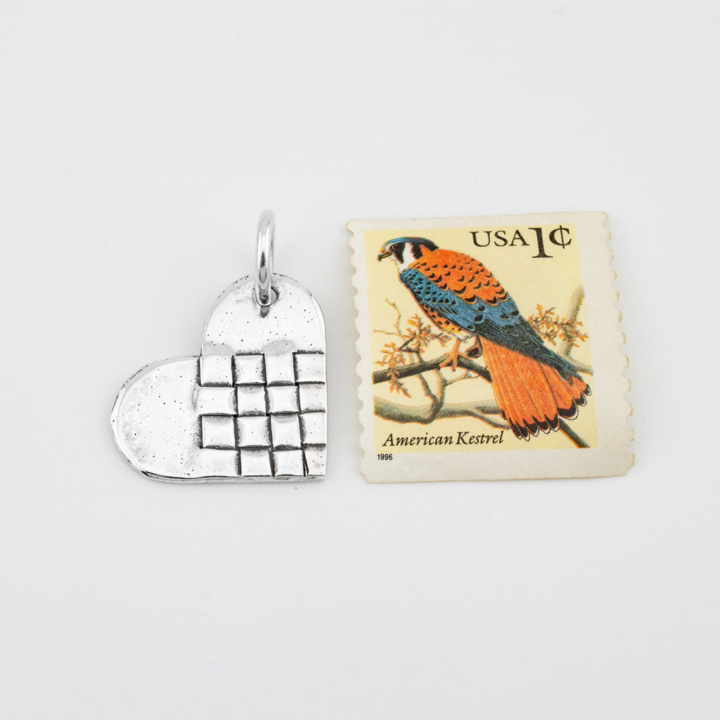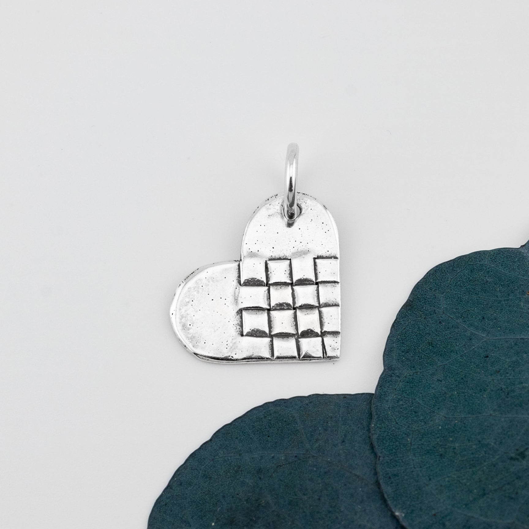 Heart-shaped sterling silver pendant with unique woven texture, created as a reminder of Romans 8:28, "And we know that God works all things together for the good of those who love Him, who are called according to His purpose."