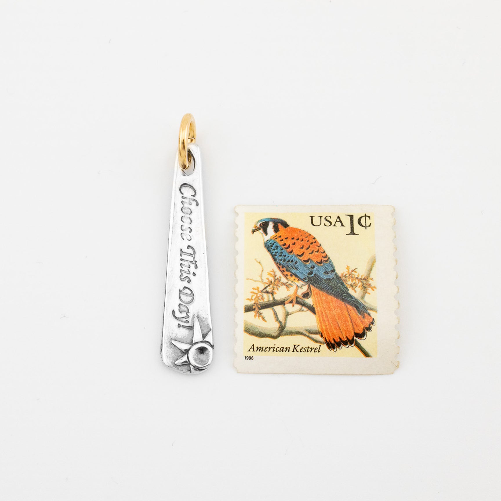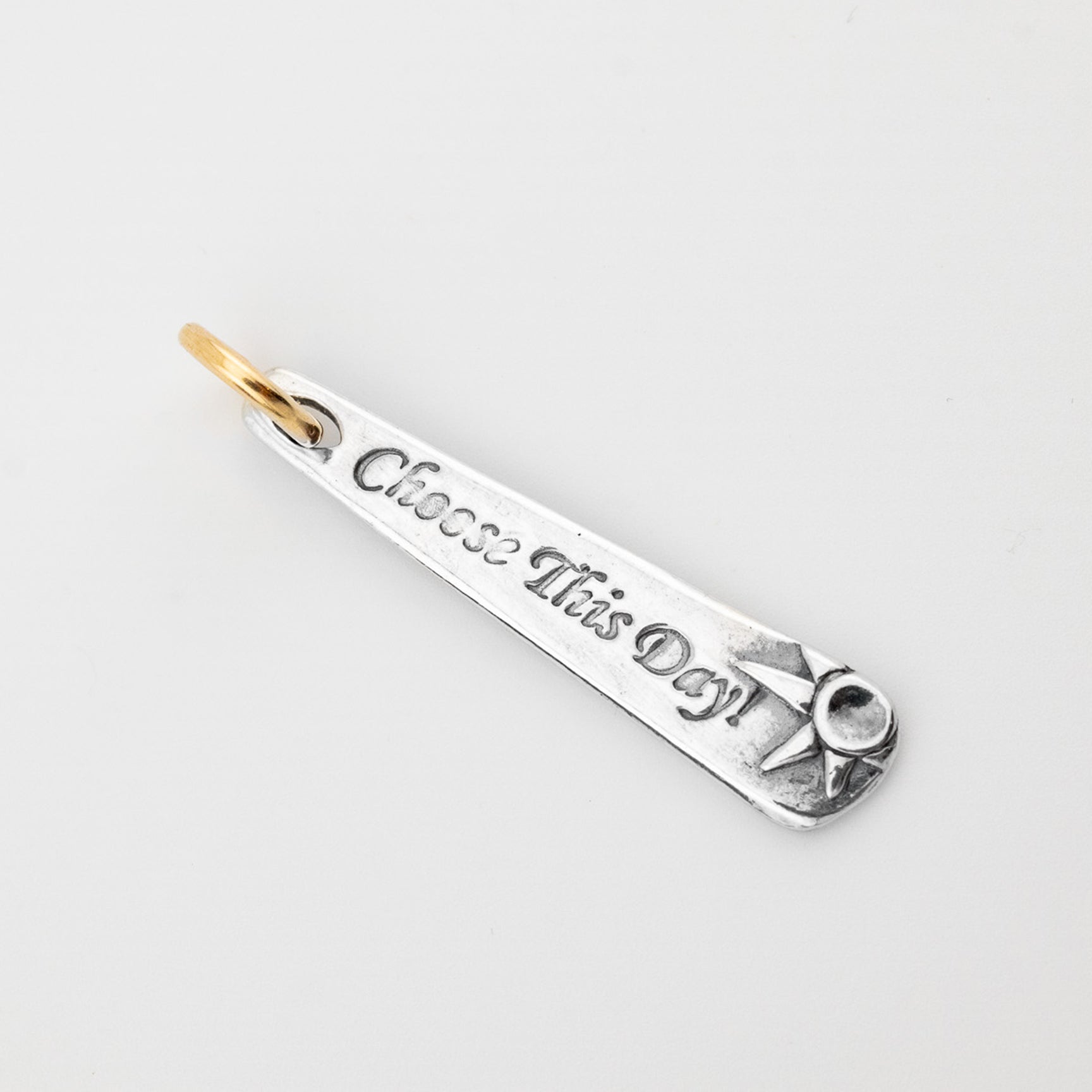 A sweet sterling silver sun pendant was created as a reminder that with each new day you choose to serve the Lord; inspired by Joshua 24:15, "Choose this day whom you will serve...but as for me and my house, we will serve the Lord."