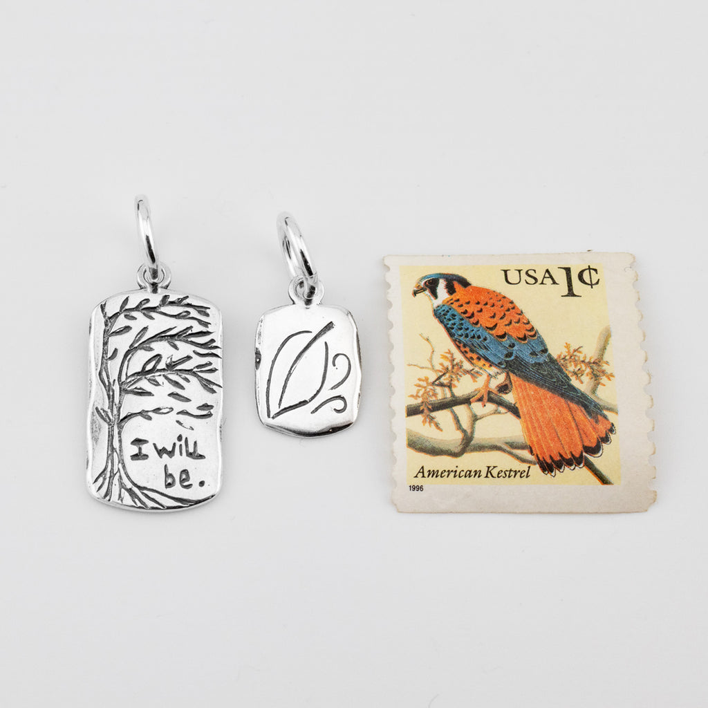 The charm reads “I Will Be,” to inspire your friend to finish the “I will be” in their own way. "I will be hopeful”, "I will be healed”, "I will be strong.”, etc. The tree on this piece is tossed by the wind but remains firmly rooted—rooted in faith even in the storm.