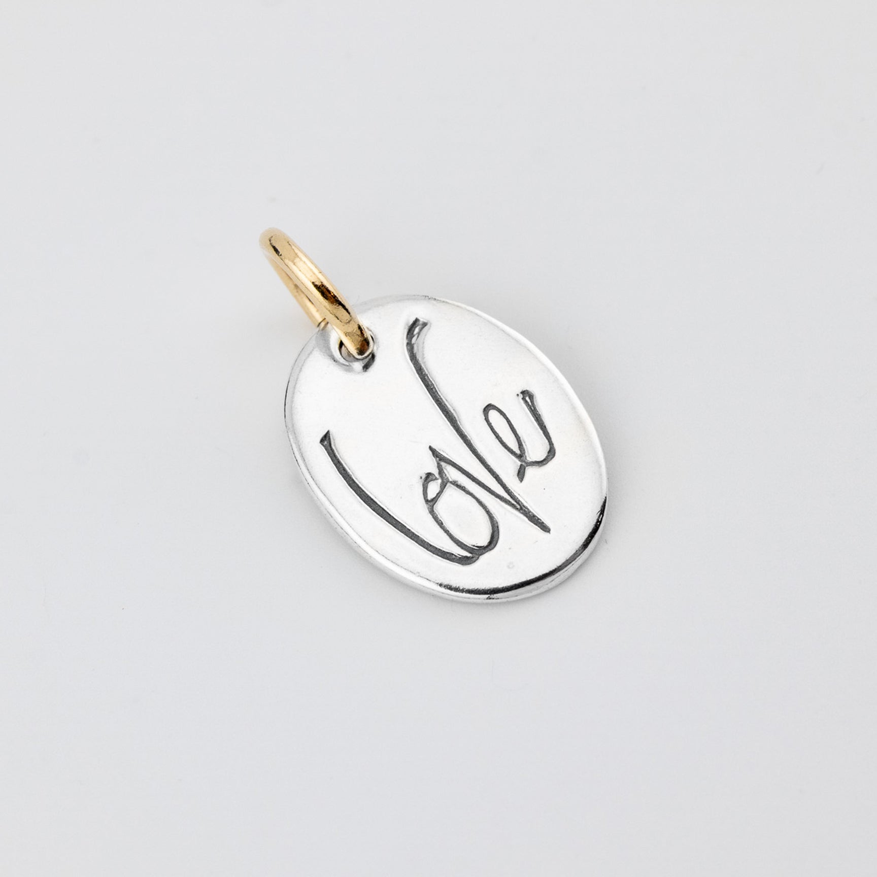 Inscribed with the word "love," it was created to be a reminder of the true sacrificial love of Christ, our example for loving others. With a small heart on the back of the pendant, this sweet charm has been finished with a gold-filled jump ring to symbolize how love is the greatest of these.