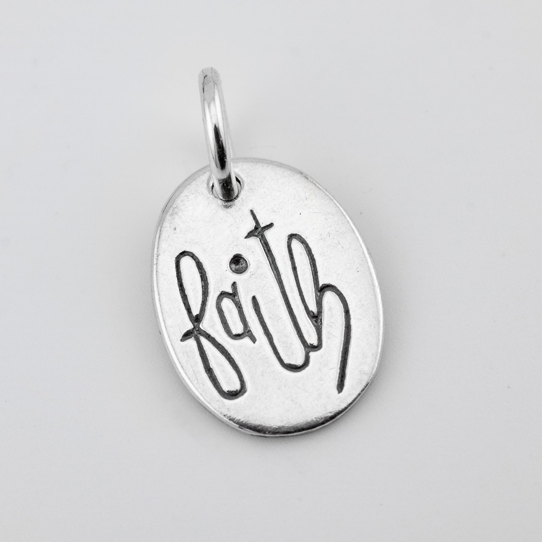 Our Faith Pendant is a clear reminder of the power of faith in Jesus has given us. With lovely hand-lettered details and an etched cross on the back, this charm is a beautiful conversation starter and a reminder of your faith.