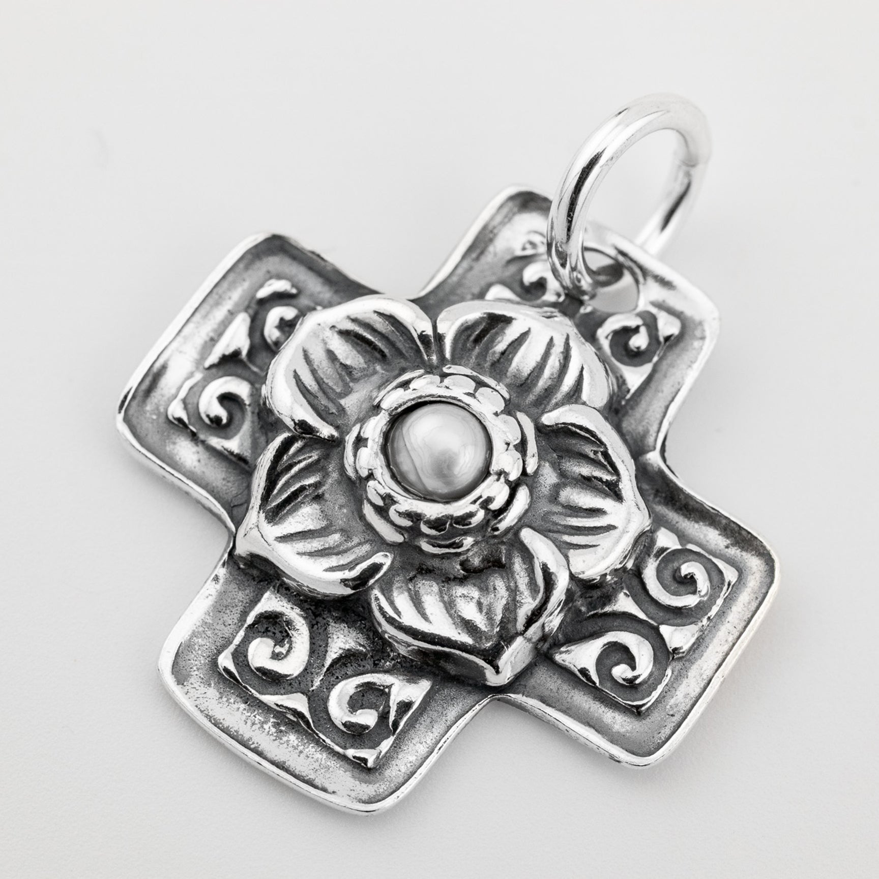 A fine silver cross set with freshwater pearl to remind you of Romans 5:8, “But God demonstrates his own love for us in this: While we were still sinners, Christ died for us.”
