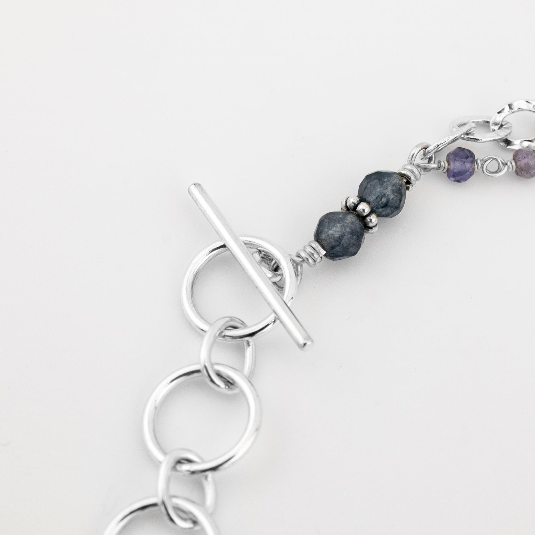 Oceanic-hued gemstones of blue sapphire, sea glass, and blue agate paired with a sterling silver plaque to remind you to be still and know that he is God.