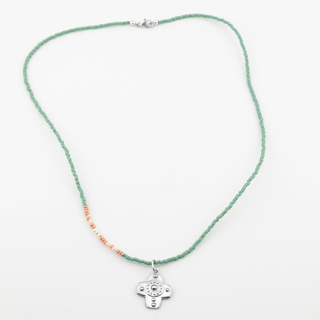 - Features genuine turquoise seed beads, pink and white seed beads, and freshwater pearl