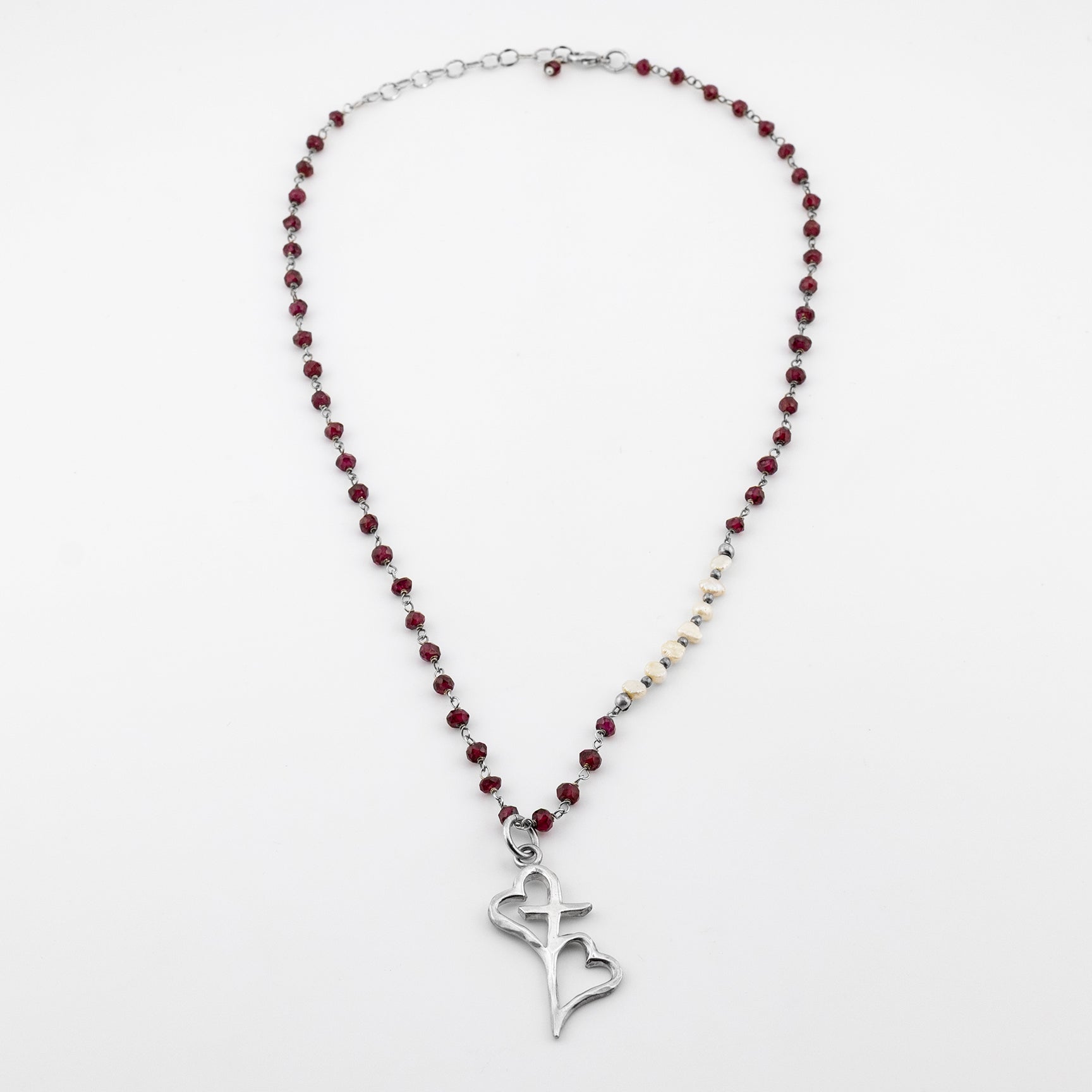 Two sterling silver hearts connected by the cross. A beautiful symbol of the bond we have with others because of God’s love for us. Inspired by 1 John 4:19, “We love because He first loved us.”