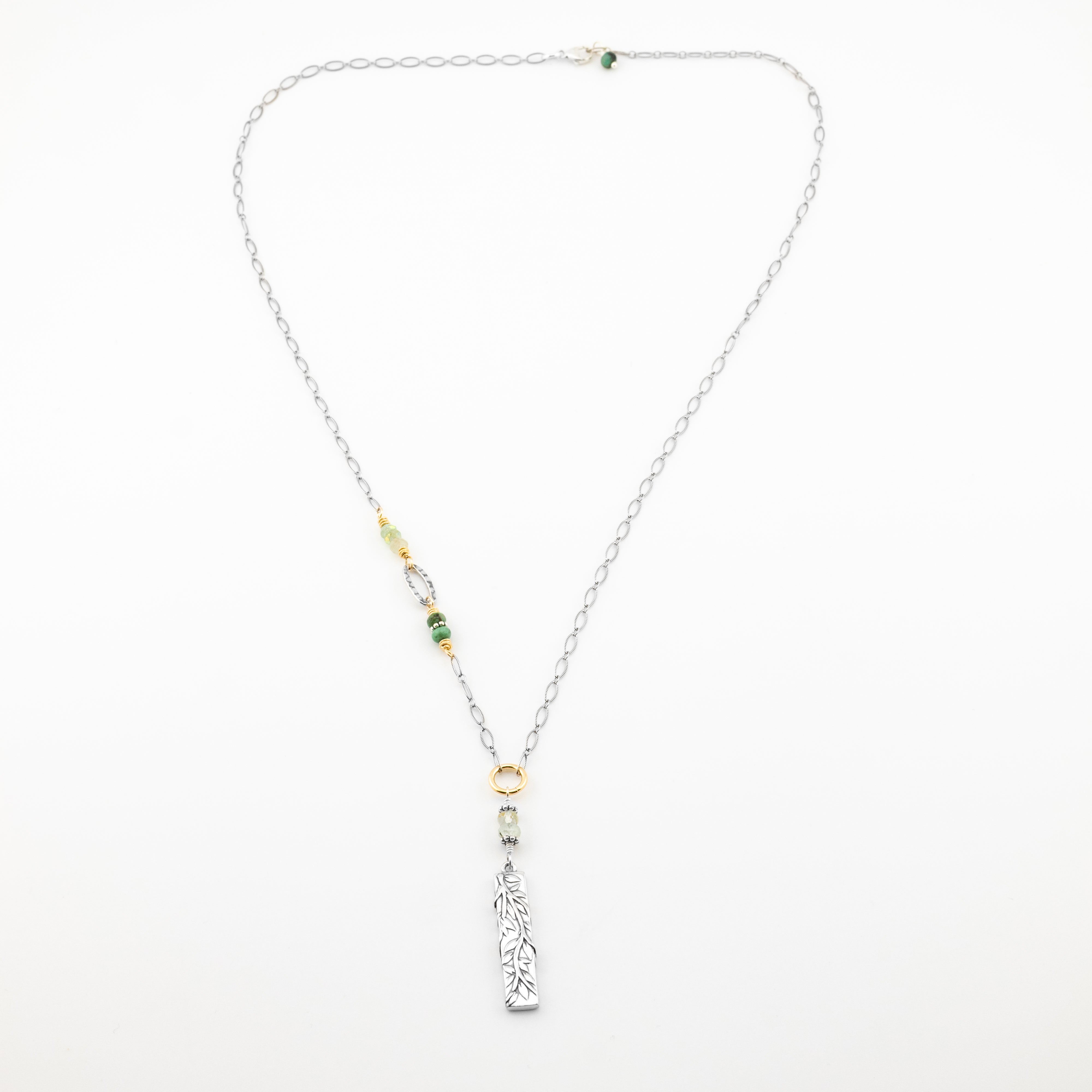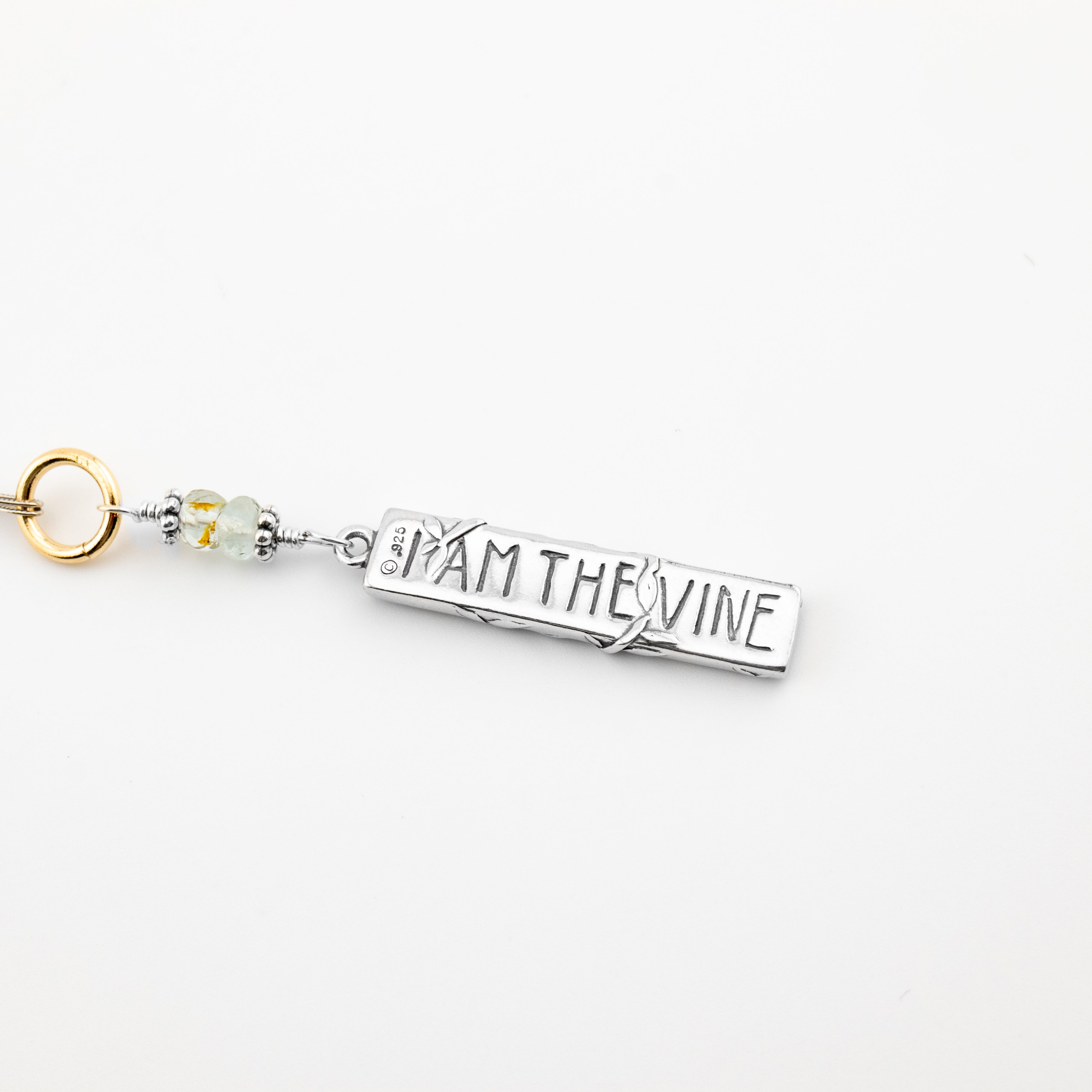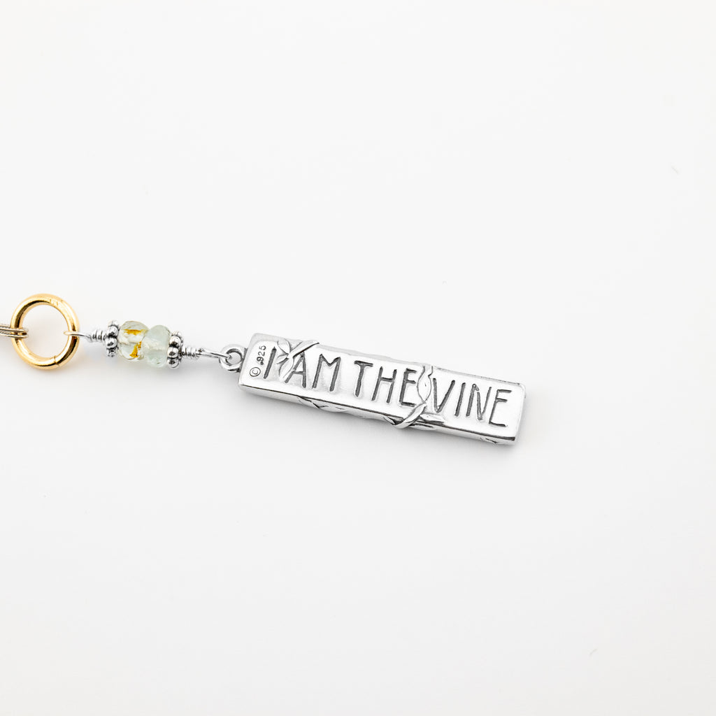 Oxidized sterling silver pendant with leaves and vines, a wearable reminder of John 15:5, “I am the vine; you are the branches. If a man remains in me and I in him, he will bear much fruit; apart from me you can do nothing.”