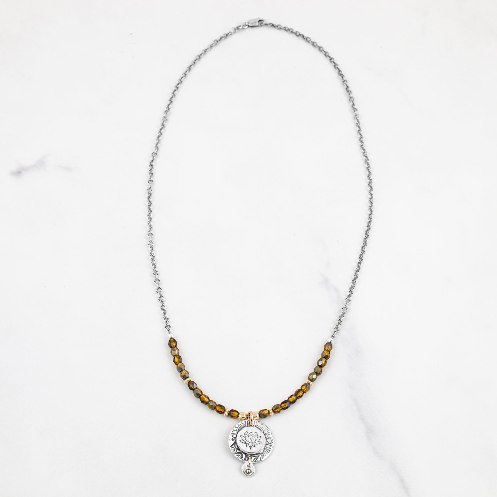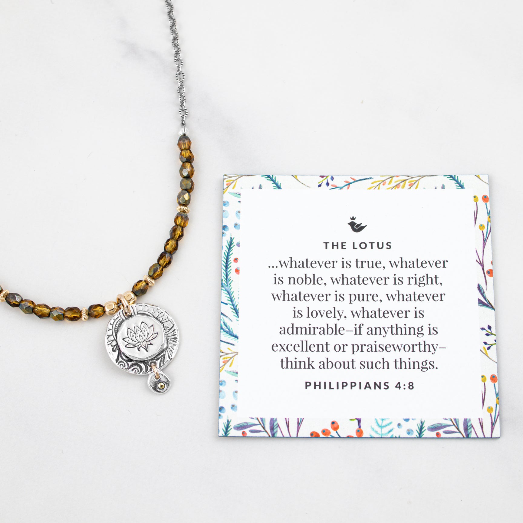 This fine silver pendant features a beautiful blooming lotus with 22k gold. Symbolic of mindfulness, this lotus was created to be your daily reminder to pause and meditate on the truth of God’s Word.